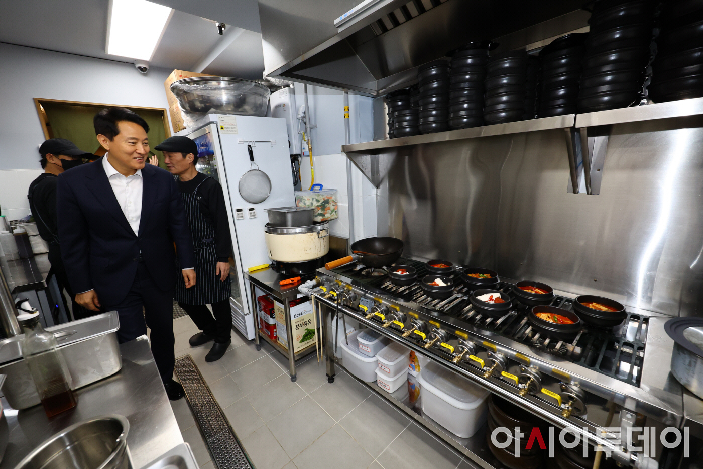 오세훈 서울시장이 16일 서울 용산구에 '희망의 인문학' 수료생들이 직접 운영하는 동행스토어 1호점 집밥 음식점 '정담(情談)'을 찾아 주방을 둘러보고 있다. 희망의 인문학이란 인문학 수업을 통해 노숙인 등이 자존감을 회복하고 지역 사회에서 자립할 수 있도록 돕는 서울시 사업이다. '정이 담긴 진심 어린 이야기'라는 의미인 정담(情談)은 참여자들이 재기를 위해서 노력하고 진심으로 음식을 만든다는 의지를 담았다. 희망의 인문학 수료생 중 조리사 등 경험이 있는 5명이 직접 운영한다. /정재훈 기자